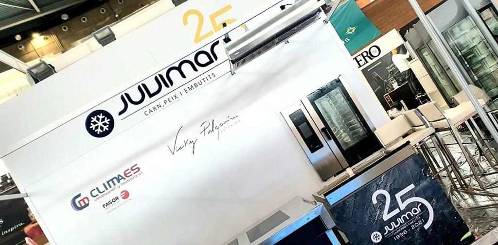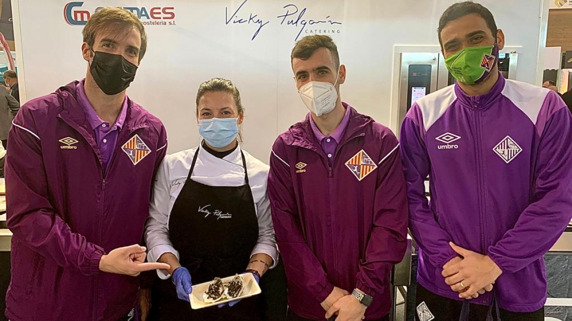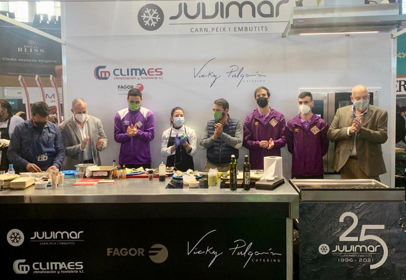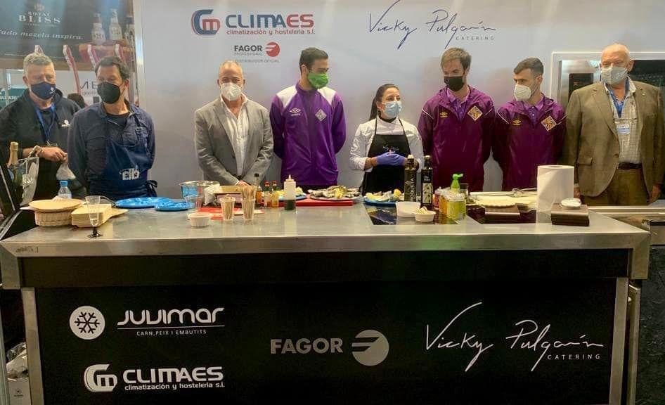 Barrón, Tomaz y Eloy Rojas asistieron a la feria Horeca para descubrir la ‘Tapa Palma Futsal’ de este año diseñada por Vicky Pulgarín, ganadora de Masterchef. La tapa es una iniciativa de los patrocinadores Juvimar y Climaes y está formada por una ostra rellena de cítricos con algas fritas verdes, representando el color característico del club.